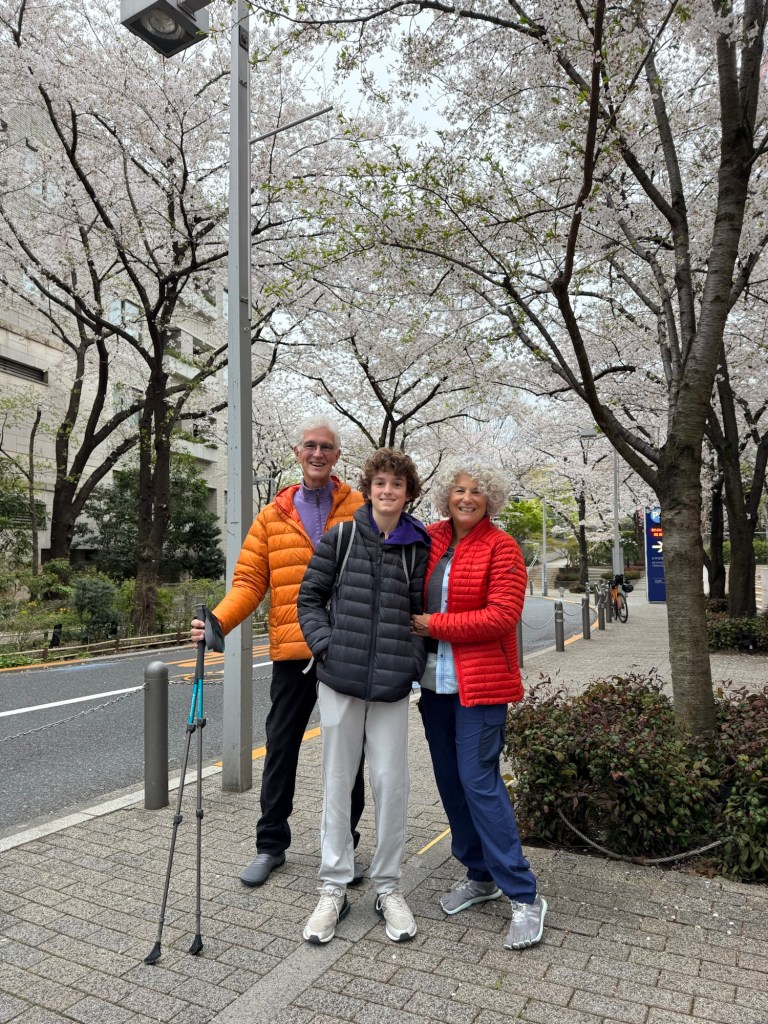 Jim: I love Japan, especially when the cherry blossoms are putting on a show. We walked a couple of miles together, exploring the area closest to our hotel, where there are a lot of tall office buildings, separated by small but beautiful gardens. Before we walked to dinner, the wind picked up and the cherry blossoms were falling like snow!