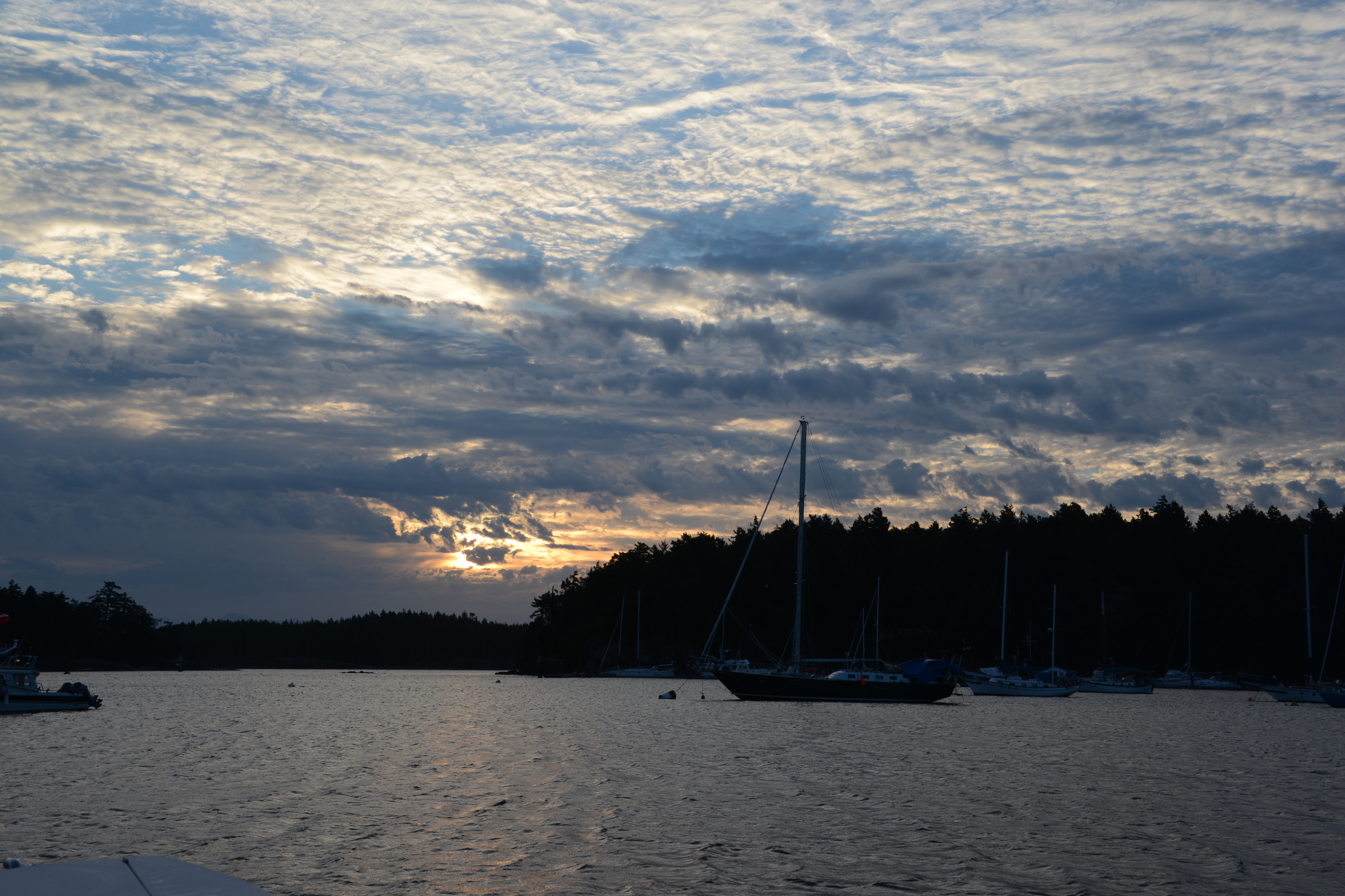 Friday was a long transitional day. It began with a ride on the only cab on Quadra Island to the little grocery store where we reprovisioned for the rest of our vacation. By the time we were done and restocked it was noon. Our goal was to reach Octopus Islands, but we weren’t sure all the tides, winds and currents would work out. We fought a strong North-West wind all day. It was even windy in Calm Channel usually true to it’s name, but not on Friday. So we explored a little bay on the west side of Calm Channel. The Captain decided to drop anchor so we could take a break while we waited for slack tide at the Hole-In-The-Wall rapids, which was our last chance to reach the Octopus Islands before dark.