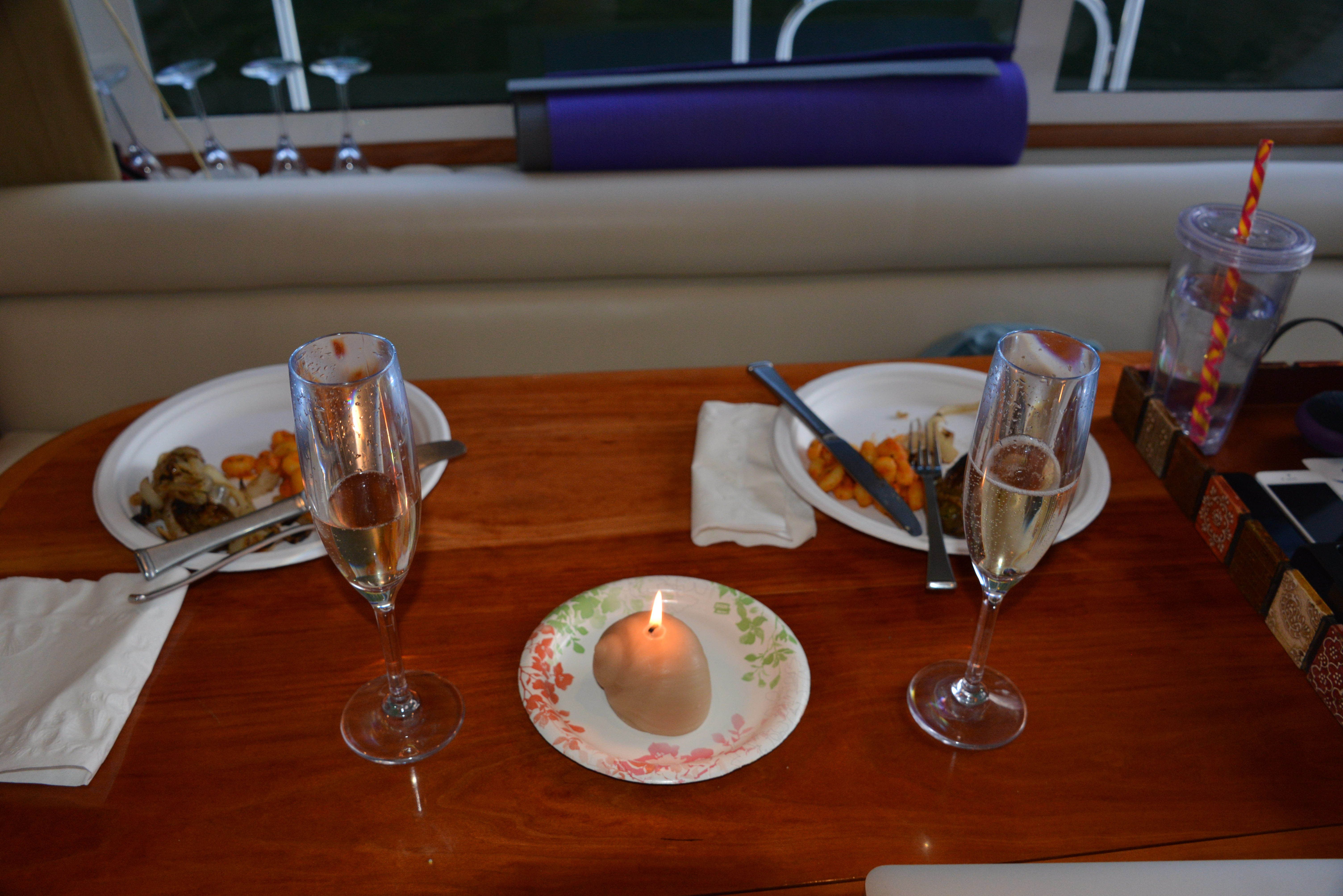 eating at the shore as we kayaked around the islands that make up this Canadian marine park. When we got back to the True Love we enjoyed a yummy steak “linner” with coleslaw. During our meal we watched a pair of juvenile herons trying to fish while being taunted by a much more successful kingfisher.