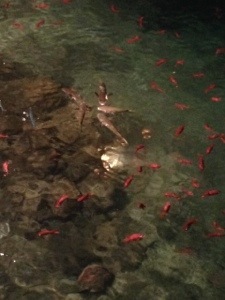 For dinner we took the boat shuttle and then the bus to the St. James restaurant which had been recommended by a couple of people. The setting was lovely, the food was presented beautifully and tasted delicious. We ate under the stars and over the water. The water was lit and we were treated to swarms of fish that were attracted to the light and even a manta ray.