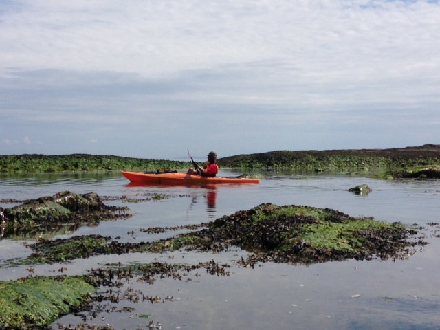 This morning we got to see our anchorage in all of its “low-tide” splendor. The sun was out but we could see the clouds in the distance so we went for a great kayak to the head of the bay, spotting the local eagle pair close to shore.