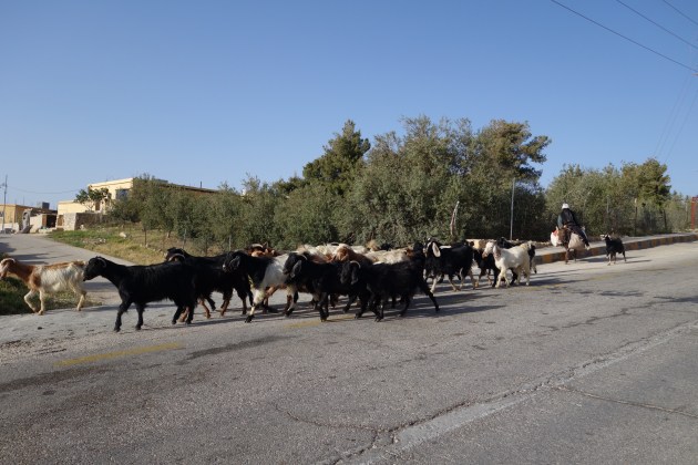 The 2 hour drive to Petra went through some interesting and diverse terrain. The mountains are unusual: red sandstone with diagonal stripes of black lava. From the barren desert we climbed into the higher hills where there was enough grass between the rocks for a few goats to graze. As we climbed to 4,000 feet, the temperatures decreased to the mid-80’s and there were a lot more goats, and even some sheep, camels and donkeys.