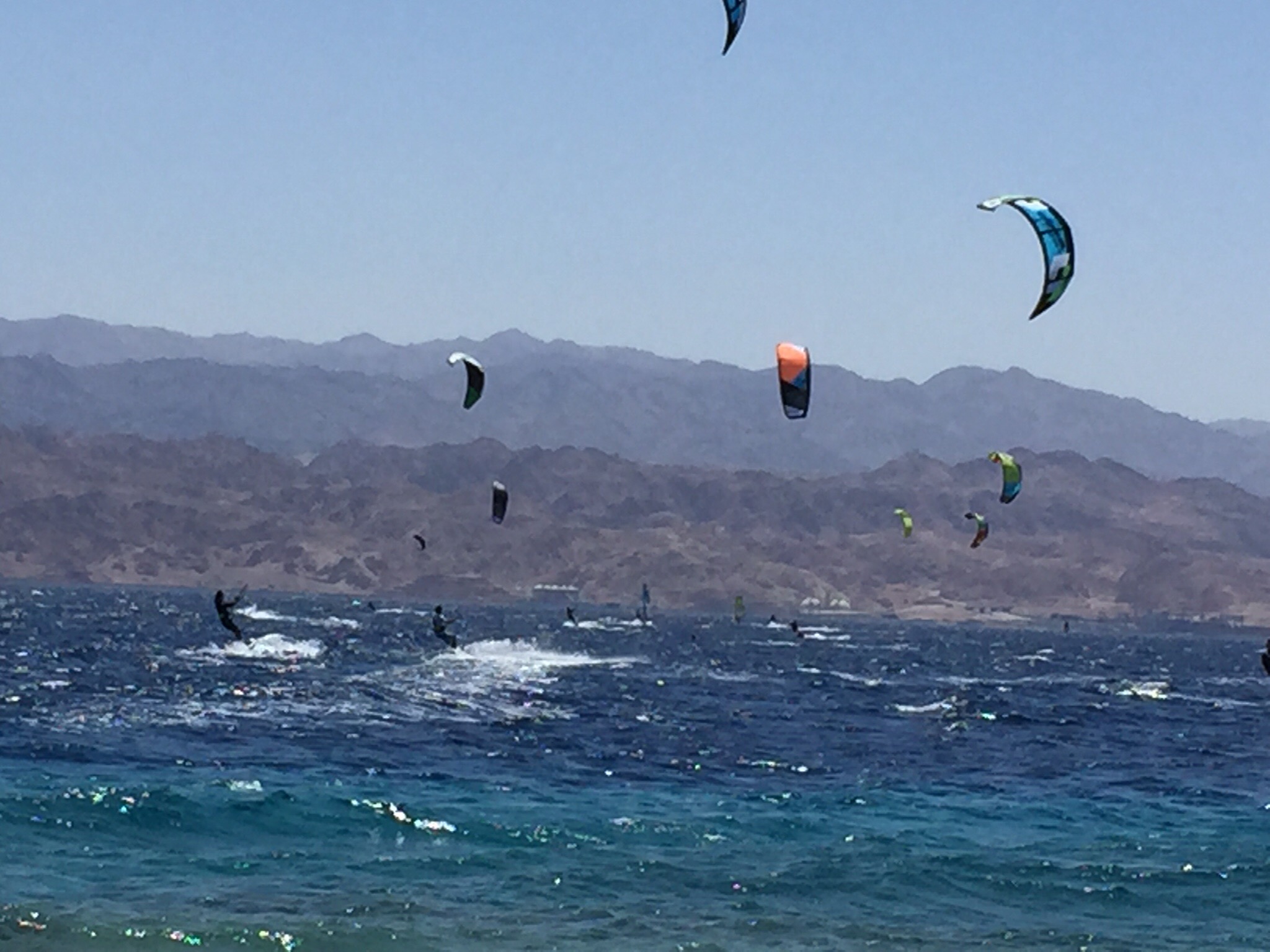 We slept soundly and spent our morning at the busy beach watching the beautiful kite surfers expertly playing and jumping in the wind. The Israeli side of the Red Sea is full of colorful activity as people play on the surf and beach.