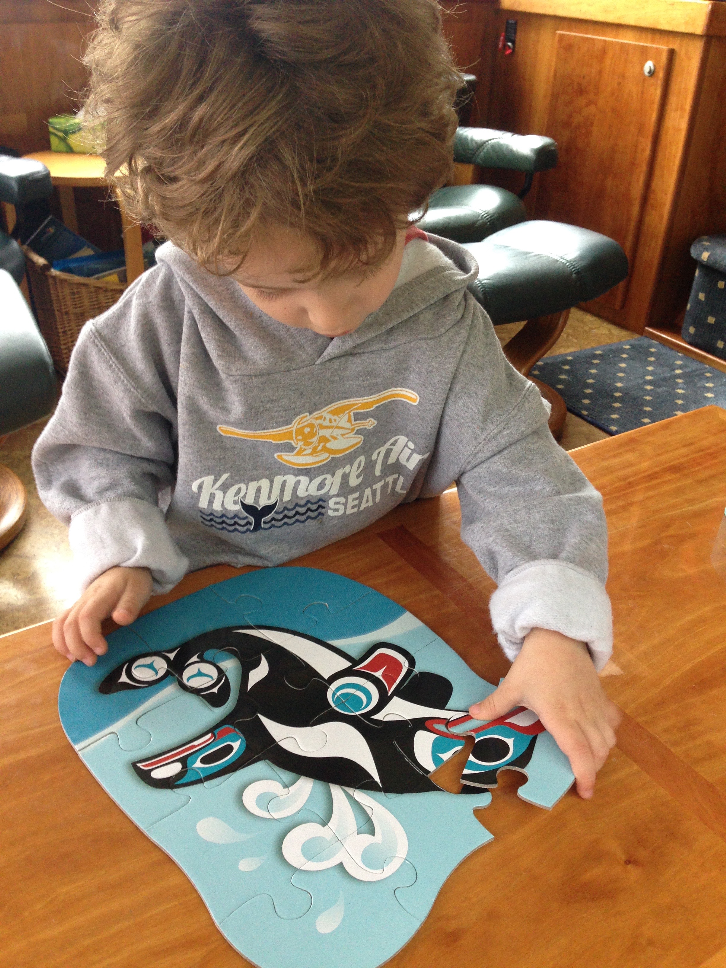 Because it was a rainy day we spent most of our time playing in the boat. But, Grandma was prepared! I purchased a great jigsaw puzzle at Blind Channel that was perfect for James.