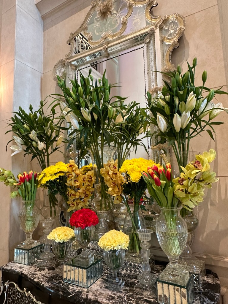 It began to rain hard as after we entered the bus to head out for our long drive. Our bus driver, Surinder, is truly superhuman. I don’t know how he does it! Because we arrived so late we hit big time traffic, add the rain and it took more than 90 minutes to get from the airport to a place where there was less traffic. The rain let up a bit, and quite honestly we were hopeful it would be an air-cleansing rain. But it made for an extra long bus ride to Agra and our Oberoi Hotel notoriously magical hotel near the Taj Mahal. I’m going to go on the early 6AM tour tomorrow morning because Tina said it was the best time for photos. Jim will join me for the main tour of the Taj Mahal later that morning.
