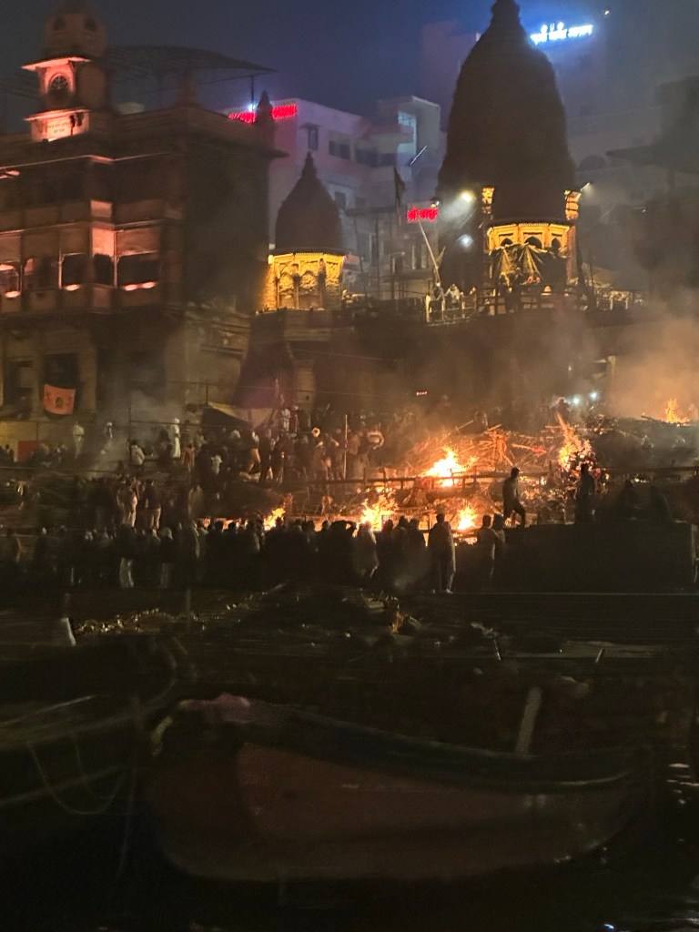 Darkness, the smells of wood burning, pilgrims, the river, the boats, the music, the prayers, the lights, the celebration of life and transition, smoke, burning the eyes, exhaustion, sights and sounds of wild weddings ceremonies briefly energized us again . . . It’s impossible to properly describe the experience, but here’s my attempt. It was otherworldly to witness the mass cremation of recently passed loved ones of devout Hindus. Their hope is that by cremating their beloved family members in this way, in Varanasi, that the departed souls will escape the otherwise eternal cycle of birth-death-rebirth and instead transition to a heavenly state of “nirvana.”