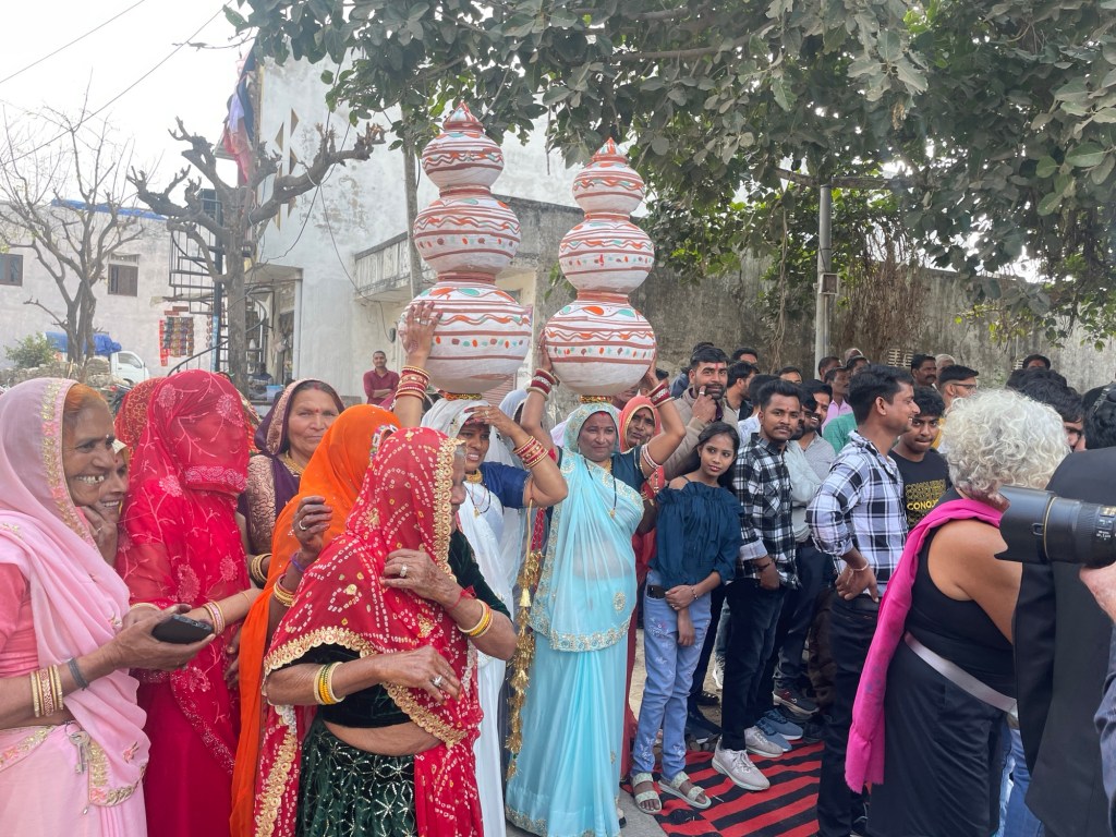The groom looked regal and was preparing to ride a short distance down the main village road to a special location for a ceremony. When we got there, we were all invited to join the festivities and draped with ceremonial orange scarves. Then the music from the giant “boom box van” started and everybody started dancing. The villagers, dressed in their finest clothes, loved that we were there with them and they embraced us, danced with us, took tons of selfies and none of us wanted to get back on the bus. Instead, we joined the procession to the bride’s house. The women of the village surrounded me and wanted to touch me, take pictures with me and dance with me. It was an amazing experience!