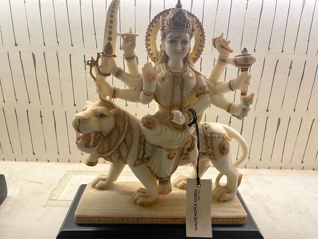 Overjoyed, but exhausted and hot, we loaded back on the bus, drank cold bottled water and settled in for a drive to a smaller refurbished palace/hotel for lunch. This place, Devigarh, was purchased by an entrepreneurial Indian business woman and offers stunning views and a delightful lunch. Apparently, the building was in a state of extreme disrepair when she bought it and it took vision and a lot of hard work to reopen it as a small hotel and restaurant. In gratitude for its success, she built a small temple there to one of the female goddesses.