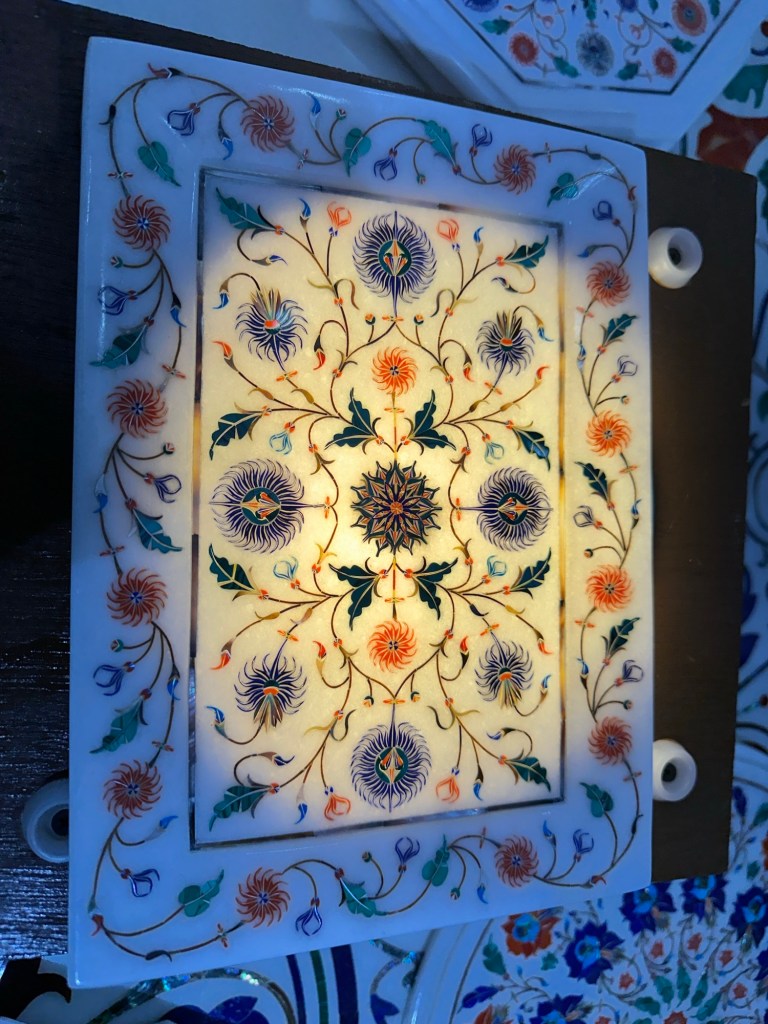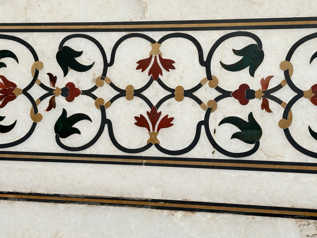 Marble and inlay work decorate every aspect of the Taj. After the tour, we went to see local artists train to create smaller marble creations with the same craftsmanship. The Indian government funds these programs to keep the ancient techniques alive for the future. We bought a small serving tray with the same incredibly fine detail to help us remember our visit.