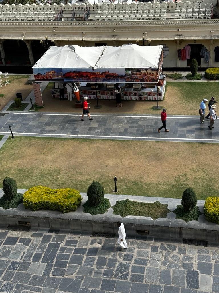 From the Observatory we walked to the nearby City Palace. Part of it houses the current descendants of the Maharajas but most of it is now a museum open to the public. One of the former Maharajas was an enormous man with gigantism disease. His clothing is huge. He commissioned lots of art, including giant silver vessels that he used to drink Jaipur water even when he traveled to England. A big private party was setting up for the night with beautiful flowers.