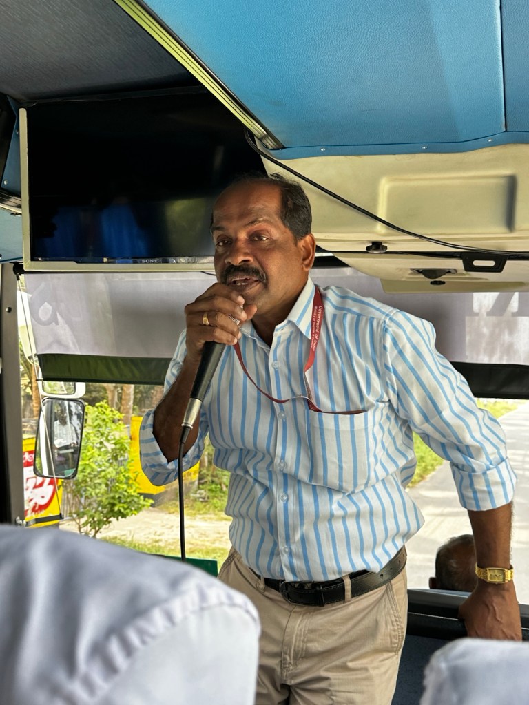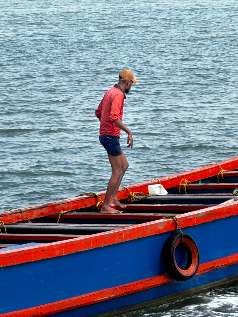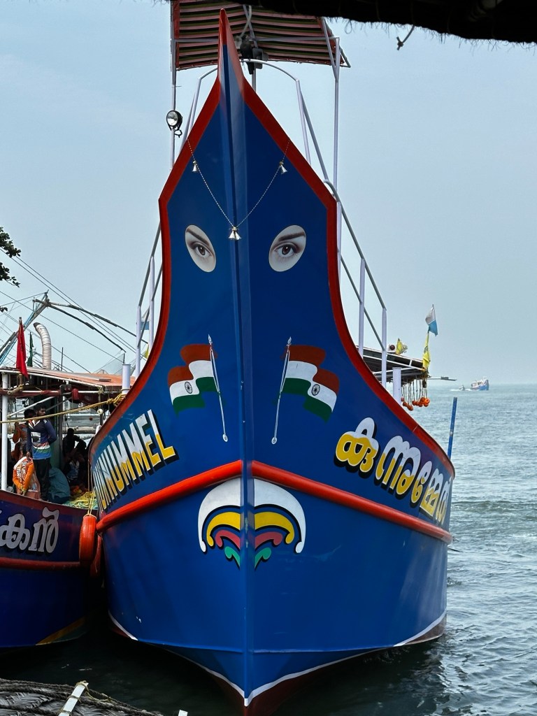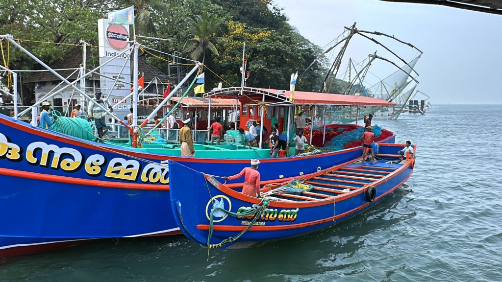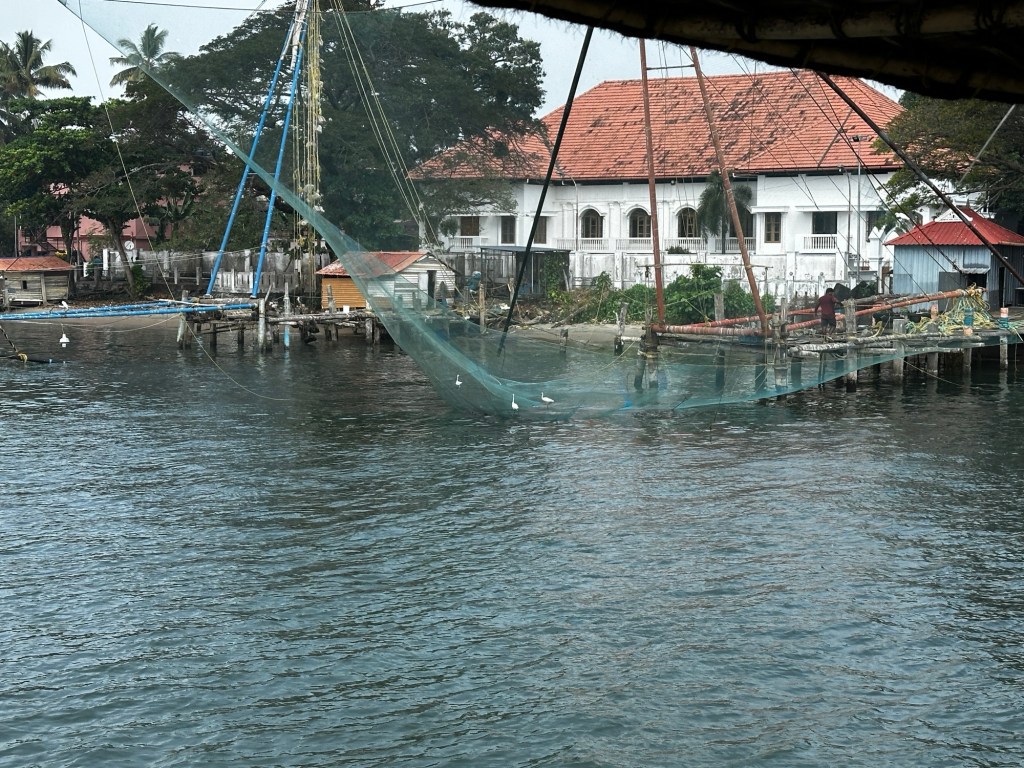 Our second day in Kochi included a boat tour of the bay complete with “Chinese” fishing nets and dolphins. Jim and I always love getting on the water. The south of India has a totally different vibe: it’s cleaner, slower, the roads are more orderly, and the traffic flows smoother. The bus driver’s good luck charms (usually Ganesh statues in the north) are replaced in the south by crosses and pictures of Jesus. Interestingly, the south has an almost 100% literacy rate due to its long history of Catholic education, beginning with the Portuguese in the 1600’s. The area also has a long history of a few large landowners and almost no property ownership for the people who worked the fields and the rice paddies. The Socialist/Communists saw an opportunity from that, supported land reform, and now control the local government in the Indian State of Kerala (of which Kochi is the Capitol). Fun fact: our bus team support person is named Stalin, which is not unusual in this area.