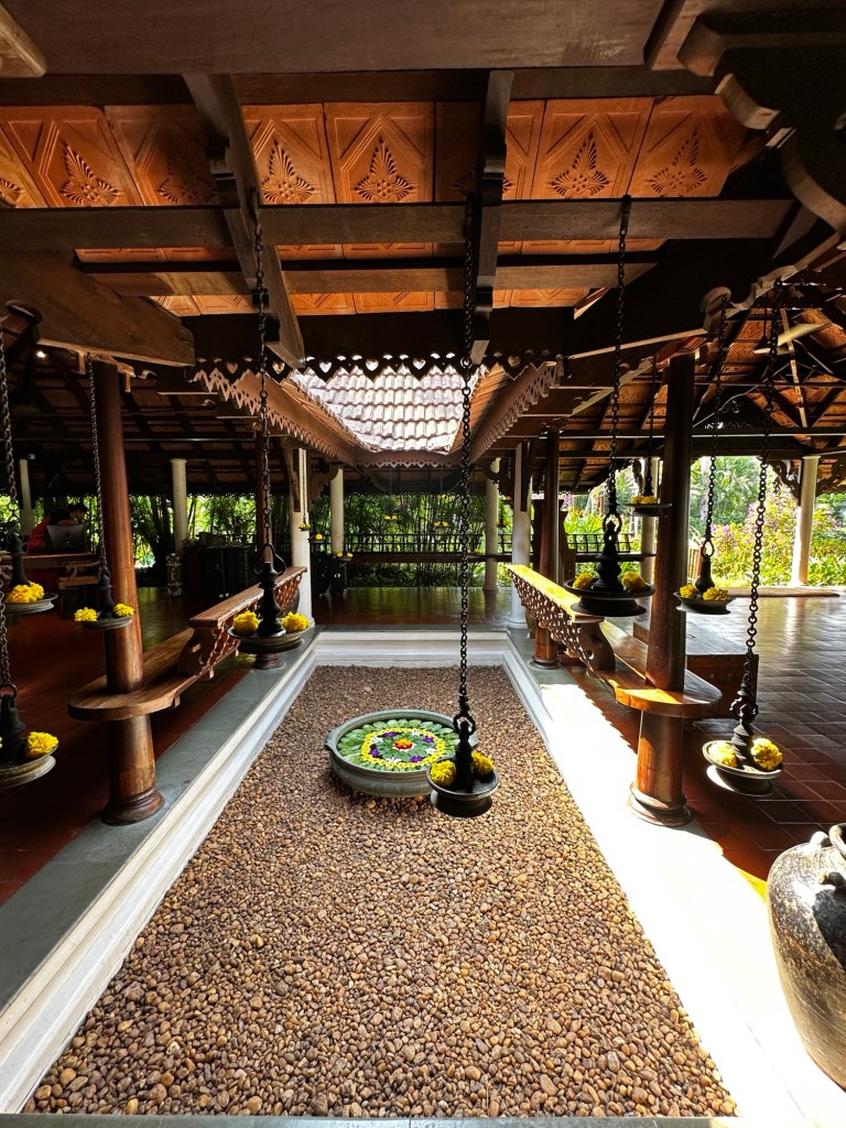 Kumarakom Lake Resort’s lovely grounds include views of the lake and a meandering “canal” swimming pool that twists and turns and allows you to swim to almost any other room. We took advantage of the “Ayurvedic” spa treatments and massages at the resort. The Rejuvenation Massage included lots of oil and two masseuses. The second day I did the Pathrapotala Swedam which is supposed to be good for arthritis. Here’s the description: leaves or powders of medicated herbs are fried in medicated oils bundled in a Muslim cloth, and then applied over the body in a rhythmic manner. The “rhythmic manner” (performed by two women) was part cupping, rug beating, and hot stones. But it only started after an “all over” Ayurvedic oil massage. What can I say, I felt great after.