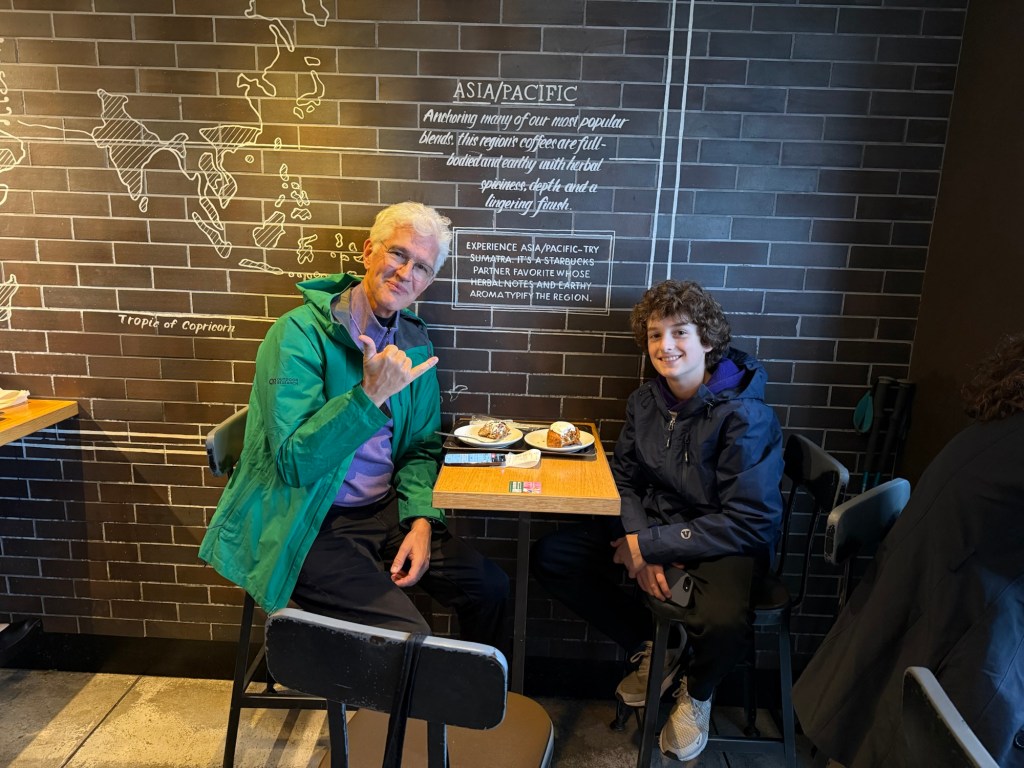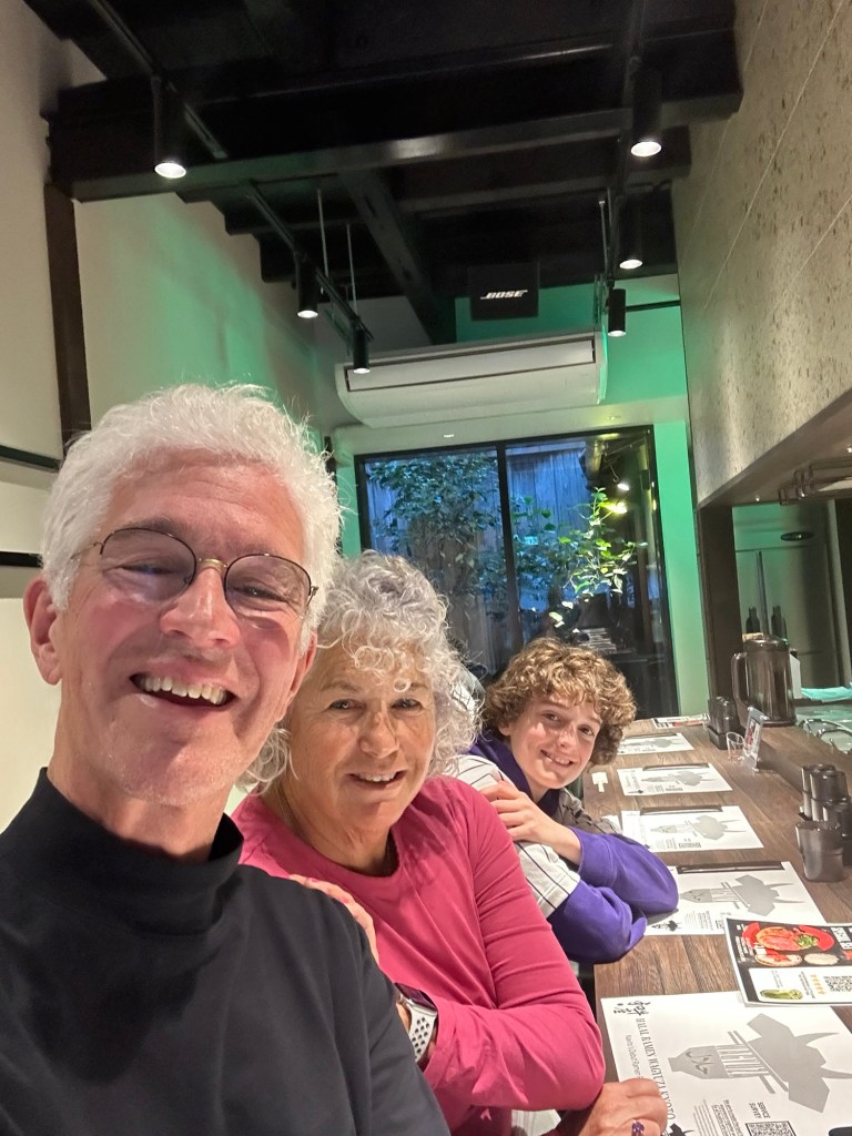 We are all getting used to our little Airbnb and Kyoto neighborhood. Tuesday was cold and windier than forecast. But we saw the rain coming so planned to do an indoor Sumo demonstration and lunch. On our way we planned to stop at a local coffee shop, but we keep running into the problem that the local shops are closed most of the time, so we ended up at a Starbucks to escape the wind and warm up a bit.