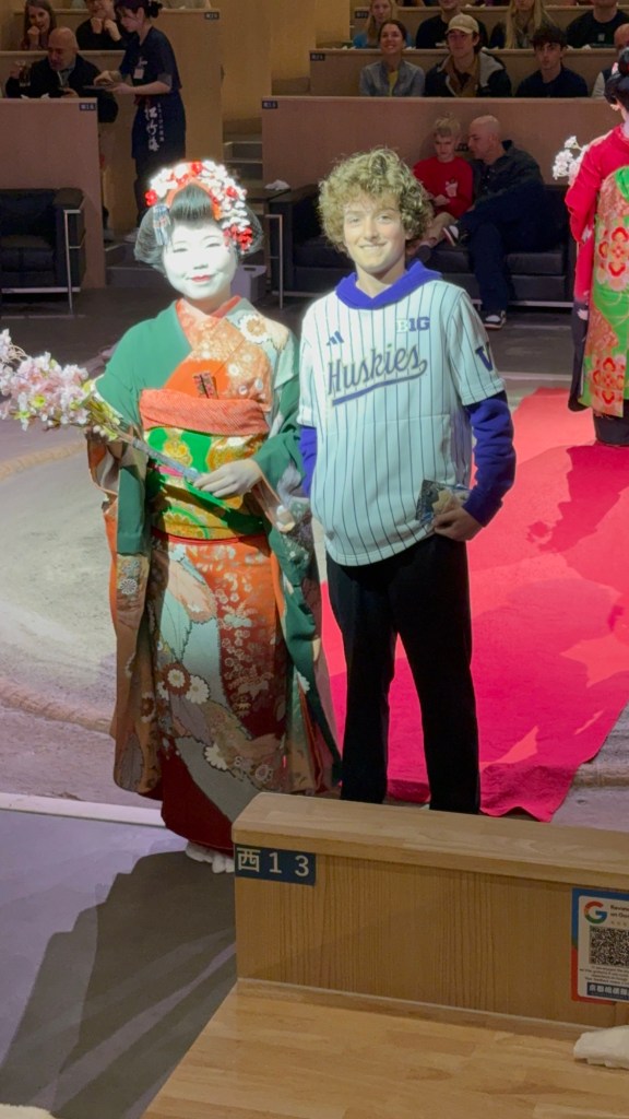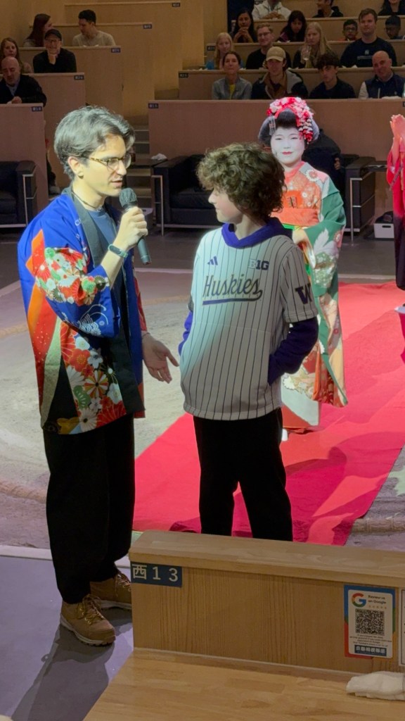 It was fun! The Sumo wrestlers are retired because of injuries, but they still love the sport. Our somewhat gimpy pair of wrestlers were still strong although no longer heavy weights. They demonstrated techniques and put on a show. In a strange, “it’s-a-small-world-after-all” twist the Master of Ceremonies was a skinny, Japanese-speaking, Italian.