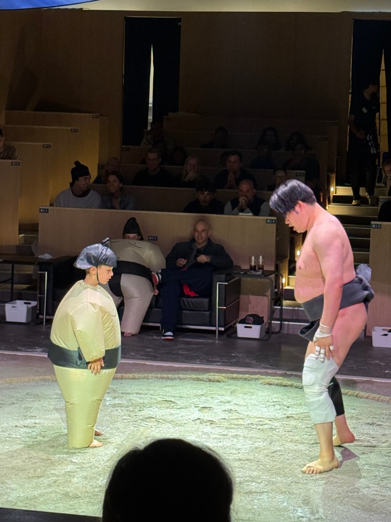Eventually, they did a bit of a real three set match. The show ended with 8 audience volunteers taking on the Sumos. A few big guys thought they might have a chance (they didn’t) but the really cute part of the show were the kids, who all wore inflatable sumo outfits and won every match!