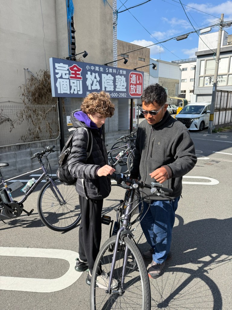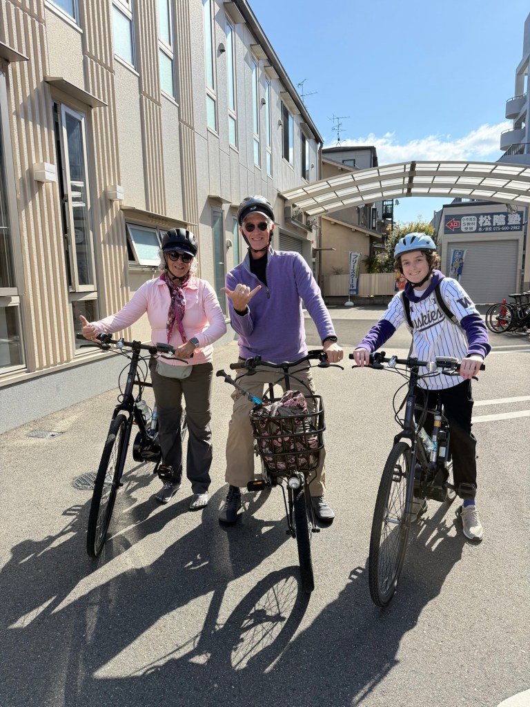 On Wednesday, we signed up for an Old Kyoto E-Bike tour. We hoped for sun and no wind and that is was we got! The day started early and we needed a cab to get to the bike rental shop to begin our tour. We used an Uber and the pick up worked out perfectly, but the drop-off was confusing because the driver dropped us off close to the bike shop but couldn’t explain how we could get there, and our phone directions sent us off in the wrong direction. I had insisted we leave early in case something didn’t work out perfectly, so we had time to get lost a bit before we called and found our way to the bike shop. James doesn’t ride bikes often and this was his first e-bike experience but he did a great job over the 5 hour tour. The day started at 9 and we biked through an interesting twisting part of the old city. The tour included stops at two Buddhist Temples and one Shinto Shrine before sharing lunch at a little ramen restaurant.