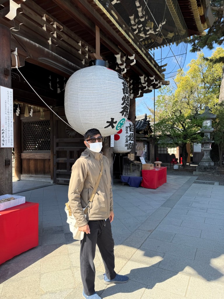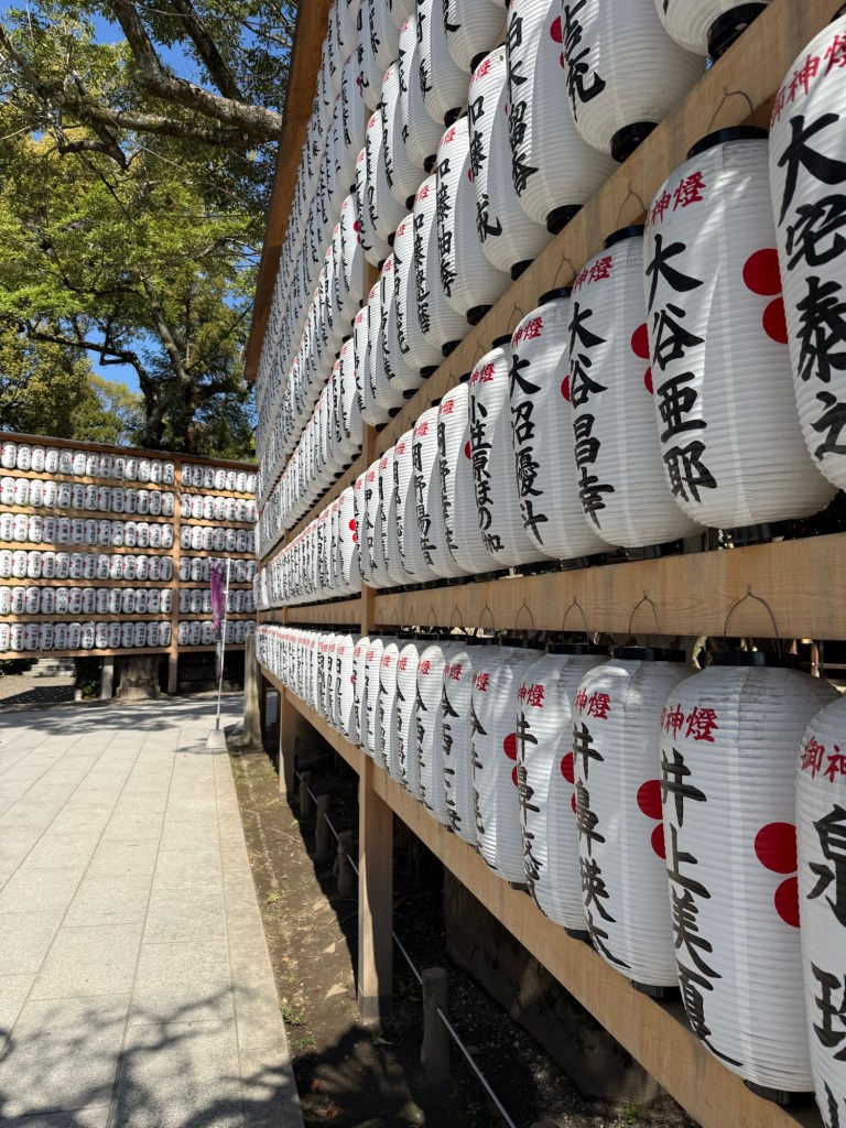 Wednesday was sunny and warm, a perfect day for our e-bike tour. I’ve always loved bicycling, and with an e-bike I’m as fast as everyone else. The Shinto Shrine we visited first was over 1,000 years old and dedicated to education and learning. The Shinto Shrine wasn’t crowded even though it is free to visit. Instead of charging admission (as the Buddhist Temples do), the Shrine sells annual sponsorships in the form of painted cylindrical banners. These banners are sold to individuals and businesses in three different sizes and there were hundreds of sponsorships throughout the Shrine.