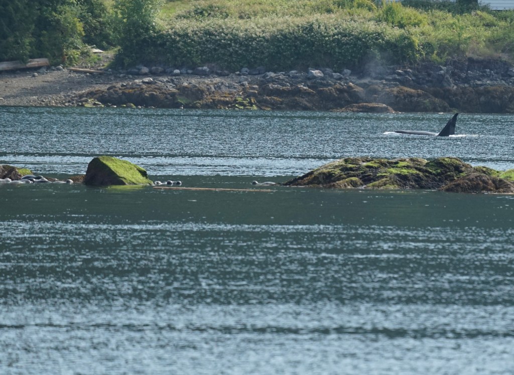 Not the best photo but this was a VERY big Orca.In this photo you can see the many seals hiding among the rocks from the giant orcas nearby.