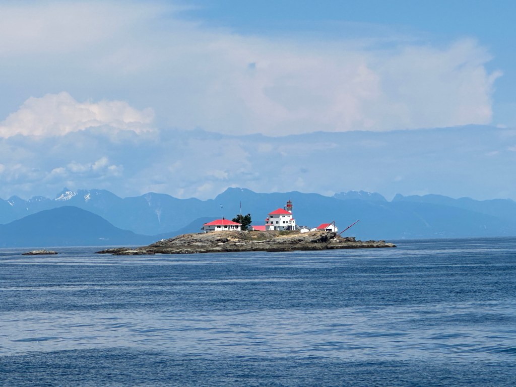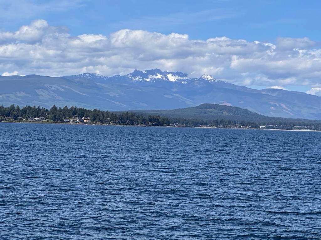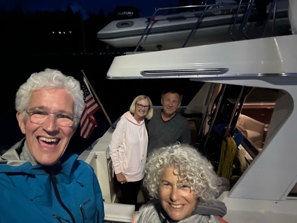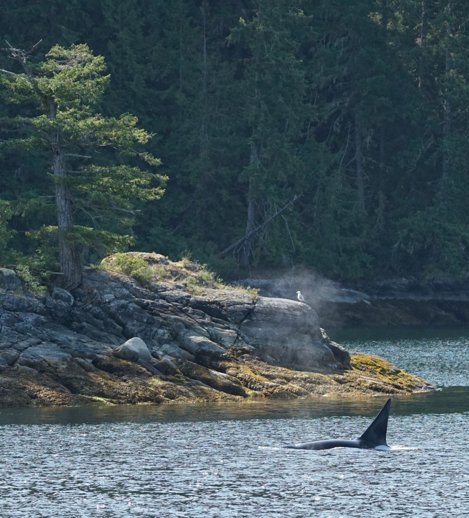 In nice weather crossing the Strait of Georgia from Nanaimo east to the mainland is easy. In winds it can be brutal. It’s where we had one of our scariest adventures, involving storms and smoke and it inspired Episode 2 of the Curve of Time Podcast. The blog post is in some old software I can’t locate. This year the forecast looked good and the crossing was easy. Four hours later we were docked at the Back Eddy Marina in Egmont where we had a nice meal on the deck and watched a beautiful sunset. Next stop Princess Louisa. But first the Orcas.