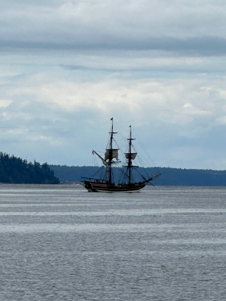 We left Seattle on Fathers Day in the afternoon, after joining in on an alumni zoom gathering of our “Awake and Alive” living with cancer group. It’s always so amazing to share survival and care stories with people who have a shared perspective on life and healing. After that, we left our home marina in Seattle and cruised north, stopping first at Langley, on the SE side of Whidbey Island. The weather was gloomy, but the winds were calm and we were able to stay just ahead of the big squalls that you can see on our chart plotter. We docked easily and the Lady Washington pulled in behind us. What a beautiful old sailing ship!