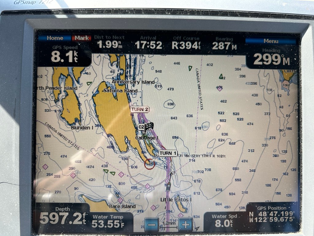 In past years we would have pushed ourselves to go all the way from the San Juans to Nanaimo in one long day so we could dash from there farther north to Egmont and then the next day into Princess Louisa Inlet (PLI), our all-time favorite anchorage in the Sunshine Coast of British Columbia. But applying our “sustainable bliss” decision rule we chose instead to cruise only a few hours the next day to Cabbage Island, just across the US-Canada border and our favorite anchorage in this area. If the winds are calm or from the south this a perfect first stop in Canadian waters. We were a bit concerned because the weather report talked about strong northwest winds overnight “near” Vancouver Island. As is often the case with Canadian marine forecasts, that is not very clear. What does “near” mean in Canadian weather speak? Who knows? We decided to take a look and see what the winds were like. We could always move further on if we needed to.