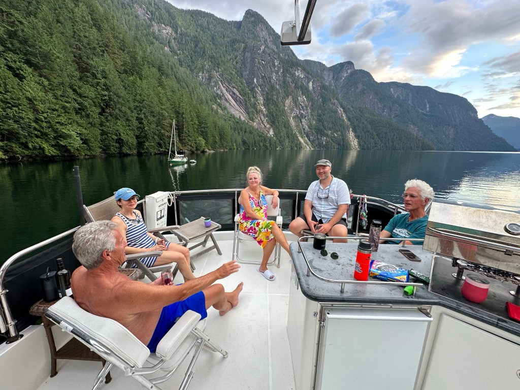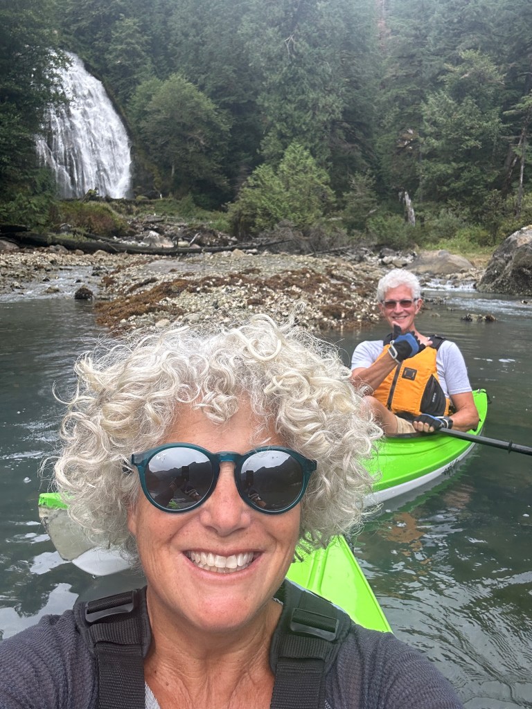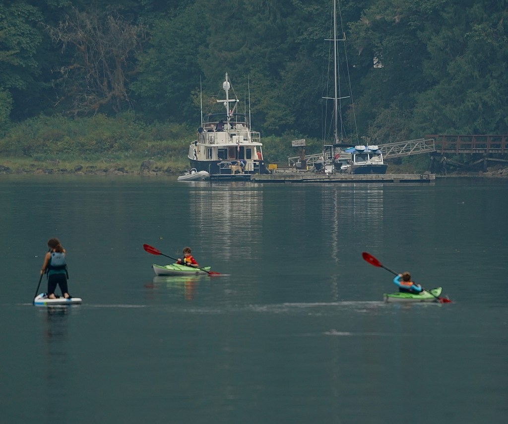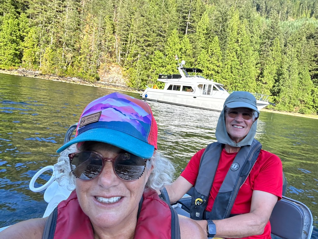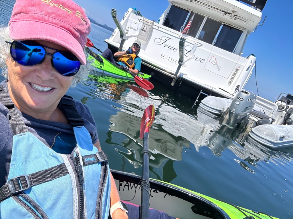 Sechelt Inlet Exploration: Yesterday we left PLI and cruised to Egmont before deciding to travel south through the Sechelt Rapids (aka Skookumchuck Rapids) and hopefully anchor near the cute town of Sechelt at the south end of the inlet. After a stop at the Backeddy for a yummy lunch we refilled the water tank and headed south. Passing through the Skookumchuck Rapids is serious business. Figuring out when slack tide was a bit complicated because our phone app “Aye Tide” had slack tide occurring 10 minutes earlier than the tide/current information in our Garmin Chartplotter. So we did it the Wylie Blanchet way, by observing it, watching two tugs go through and then passing through with visual confirmation of the near-slack current. As we passed through the rapids the kayakers at Rapids Rock waived at us while waiting for the current to get back into the “fun” zone (for them). We feature the Skook in the Curve of Time Podcast episodes 3 and 4: Adventure at the Skook and Finding Dad. On another fun note over 2000 people have listened to the podcast so far! Now we just need a contact with a movie/video producer so we can upgrade to streaming on Amazon, Disney, Paramount, or Max. So good readers, we would love your help if you know anyone who might meet with us!