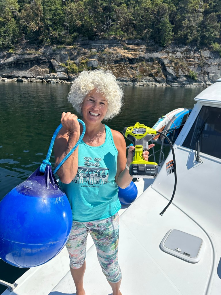 This was only the latest failure of one of our inflatable products in 2024. Earlier this year, we lost two paddle boards to overinflation explosions caused by the hot sun at our condo in Hawaii (another long story). And 2 other older paddle boards on the True Love failed after being stored outside over the winter. The good news is that the new Costco paddle board we bought just before leaving Seattle came with an electric pump that used an electric cigarette lighter plug.