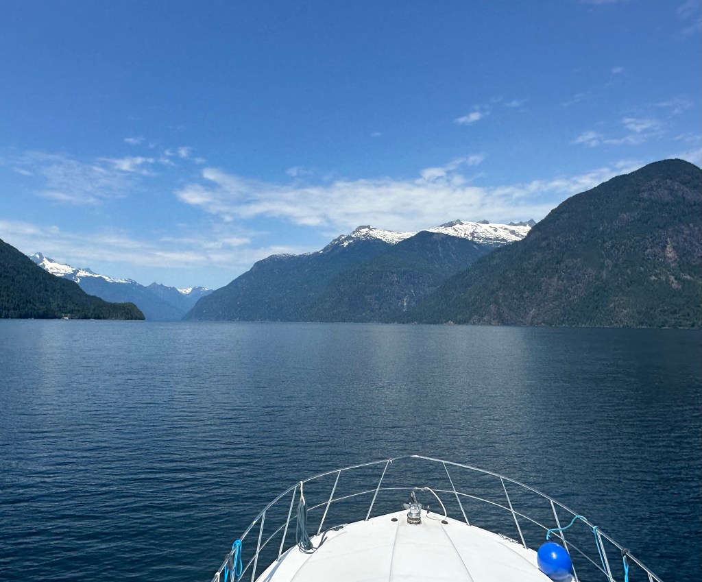 Sunny, warm and calm, the journey up Jervis Inlet was perfect and we listened to music and danced along.