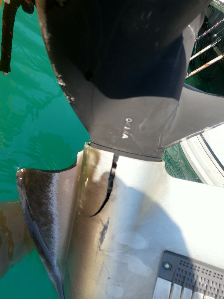 But that wasn’t the biggest “stoic challenge” of the day. Lounging on the pizza floatie, I looked over at the tender and noticed a strange crack on the lower shaft of the 40 HP outboard engine, right next to where the propeller was. It looked wrong. I took pictures and texted our support team back in Seattle. Alex responded immediately that it was a very big deal and we really shouldn’t use the engine anymore! Oh no!