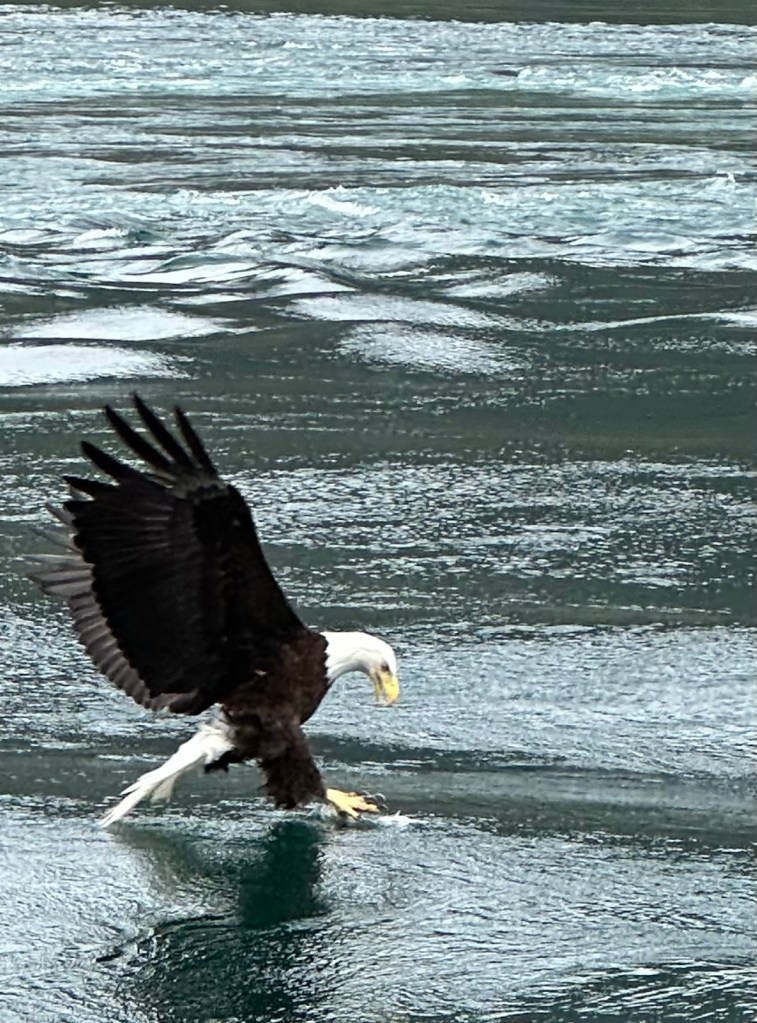 We really have had a lovely week. As expected Dent Island filled us with great food, loving care, a jet boat thrill ride and tranquility. We’ve never taken the jet boat ride before. But his year the “Super Moon”tides were creating some super big tidal rapids nearby and Trish told us there were surprisingly a couple of spaces still available. Oh my what a thrill! Riding on the flat bottom jet boat is the only safe way to experience the powerful, bubbling tidal rapids that surround Dent Island. As intelligent boaters, we work hard to schedule our arrival at Dent at “slack” tide to avoid being caught in even mild rapids. But the jet boat can go out even when the rapids are at peak tide! It also is a perfect time to get up close to the eagles as they swarm and dive to catch the hake fish that get stunned by the churning water and then rise to the surface where they are scooped up like eagle potato chips. We’ve only seen this once before in the area when our California friends Greg and Carolyn were visiting for a few days.