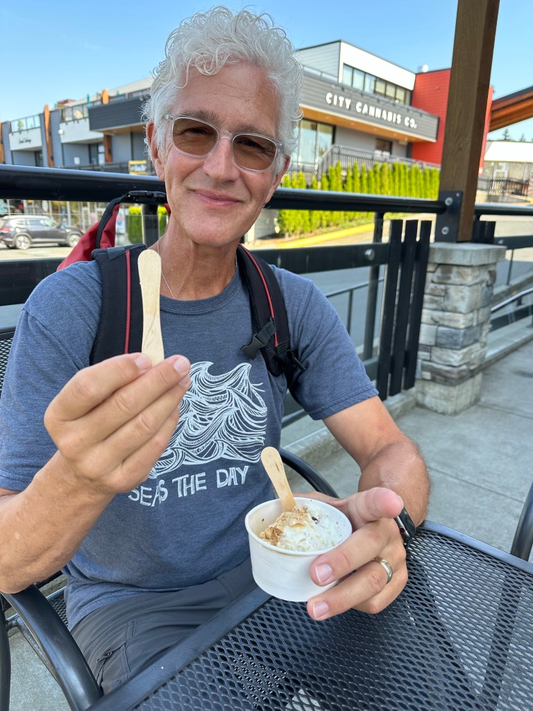 Powell River is quite the foody place so eating out is a must. We began with dessert first, yummy ice cream at the Logger event, and then a lovely “linner” with great food and a view. At the restaurant we chatted with a man from Seattle. He heard us discussing the crazy political situation and we all found a lot of agreement about the mess we are in. He’s the head researcher at Children’s Hospital. We told him we are part of Dick’s and he thought that was amazing. He had met someone on the ferry coming over from Vancouver Island who told him that when he is in Seattle he always goes to Dick’s. Then he met up with us. We love hearing stories like that. Back at the True Love we did some necessary cleaning and enjoyed another wonderful sunset glowing off the Salish Sea.