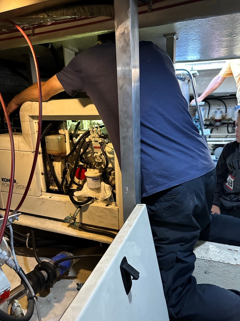 We began by checking to see if the seawater intake or filter was clogged. Nope. That wasn’t it. Plenty of seawater was available to the generator, it just wasn’t circulating.