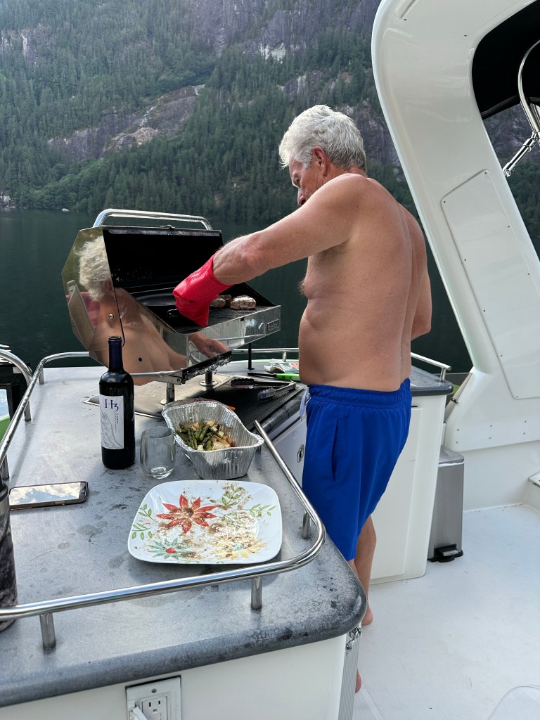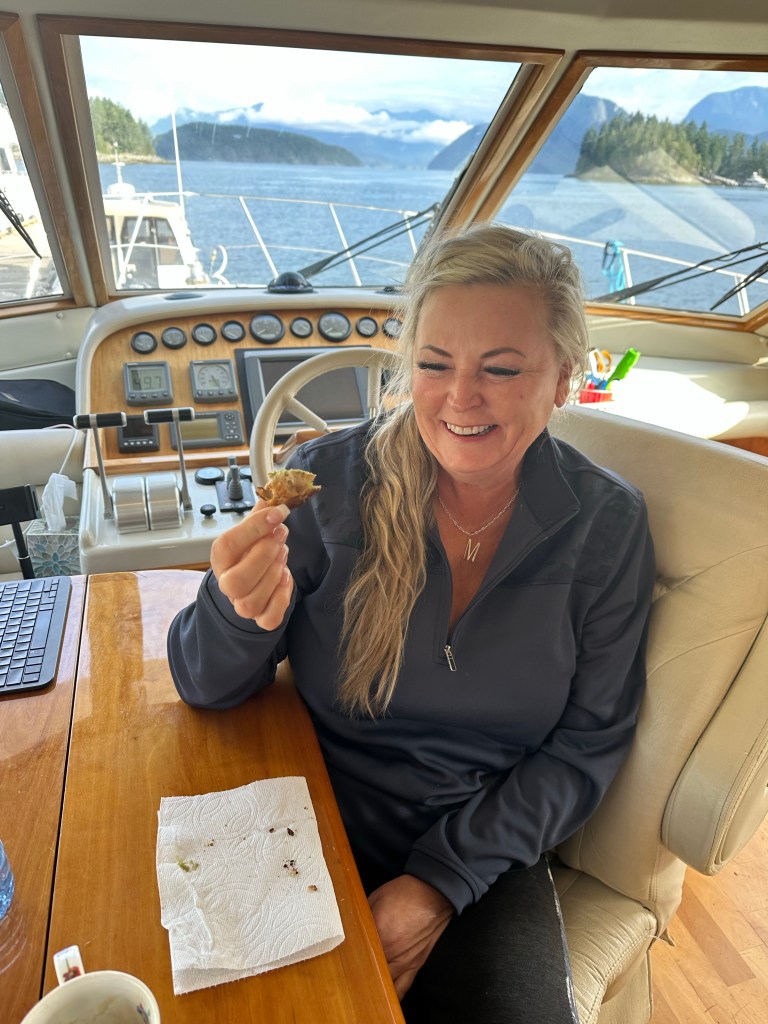 But first we must digress into our delicious meals. Ken is quite the chef and had purchased in Whistler (where he and Maria were before driving to Egmont) and along the way from there to Egmont, all sorts of amazing culinary supplies so that he could prepare 3 exquisite meals for their 3 day visit to the True Love. While at Whistler Ken and Maria had purchased and pre-souvied meats for the trip. Yes, Ken travels with his sou ve machine. Although we were still tied up to the dock at the Backeddy on our first night together we ate yummy salmon, garlic-cheese mashed potatoes and salad. It was an honor acting as Ken’s sous chef.