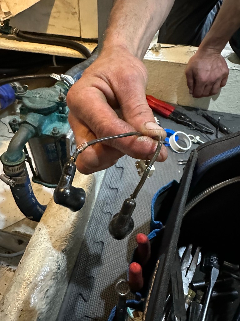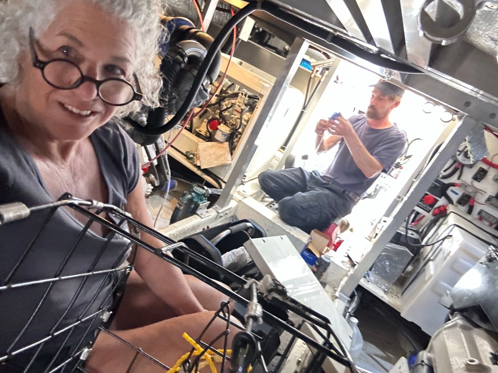 Mike arrived a little after noon and I joined him in the engine room again to watch, assist and learn how to install a fuel pump on the generator. I took lots of video and photos. But, it was complicated. I’m not sure I could do it even now. But Mike is a real pro. After it was installed we tested it by jumping it, this time using the mini jumper cables that come with the part and voila! It came to life! Fantastic. With the pump humming along we were able to bleed the fuel lines of air and then gave the generator another try. And ….. nothing! The generator would still not start no mater how long we cranked it. Now what?