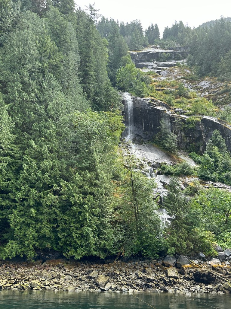 This summer we’ve definitely learned that August is dry in PLI. Yes, the water is warm and the phosphorescence abundant, but only the few glacier fed waterfalls (like Chatterbox Falls) continue to run; the 20+ other “seasonal” waterfalls only run after it rains. As we thought about our options, the idea of just the two of us cruising back into PLI for one last late summer storm that would recharge the seasonal waterfalls seemed like the right thing to do. So we left Egmont and headed back to PLI for our last visit of the season. After cruising through Malibu Rapids we were welcomed into the inlet by a very young but flying mottled eagle who seemed to be struggling a little with flying, but learning to do what eagles must do to survive and thrive.