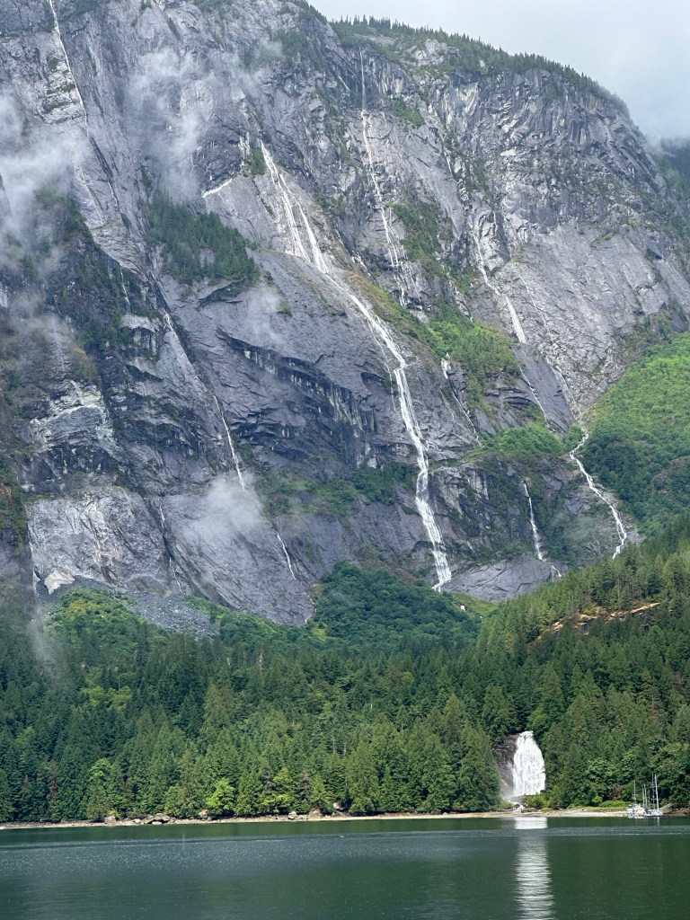 The first two nights we were here, another boat was in our favorite anchorage, so we tied up to a mooring buoy. By yesterday the other boat left and we moved to our favorite anchorage, between two smaller waterfalls and within sight of the big waterfall, Chatterbox Falls, at the head of the inlet. Our new tender is awesome and the generator is working flawlessly. It feels like our stoic challenges are behind us, at least for now.