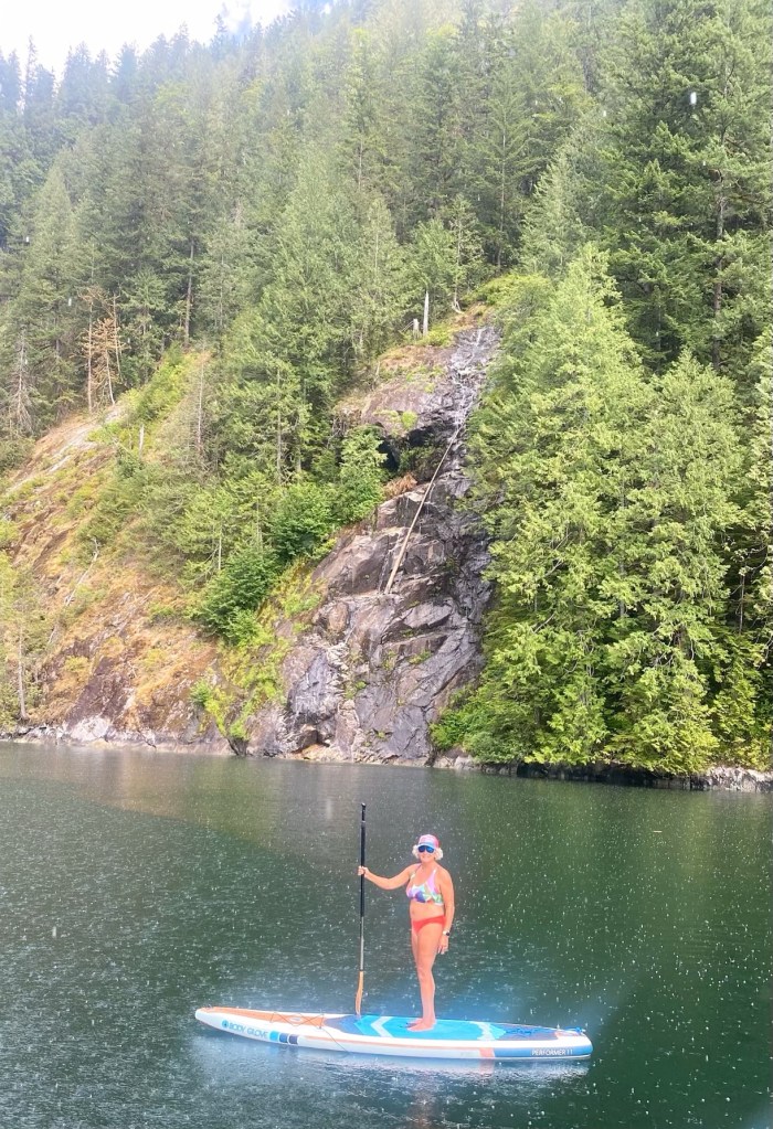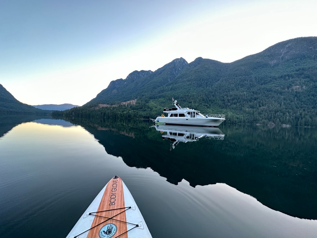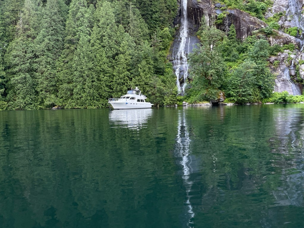 After a beautiful cruise we traversed Malibu Rapids and entered PLI. As we reached the end of the 4-mile-long inlet surrounded by tall mountains and waterfalls we noticed that our usual anchorage spot was taken. Bummer! But one of the 4 mooring buoys was available. Great! It’s been quite a while since we have used a mooring buoy because in Washington State, the mooring buoy’s at marine parks are limited to boats less than 40 feet long (our boat is 57 feet long). But here at PLI, there are five buoys for boats up to 70 feet long. And the one open buoy was in the perfect location, close to one of the small waterfalls and with a clear view of the big waterfall at the head of the inlet (Chatterbox Falls). I quickly deployed the paddle board so that I could thread the bow line through the buoy and hand it back to to tie off. Given how tired I was, it was another blessing in disguise that we didn’t have to shore tie, which would have taken at least another 30 minutes.