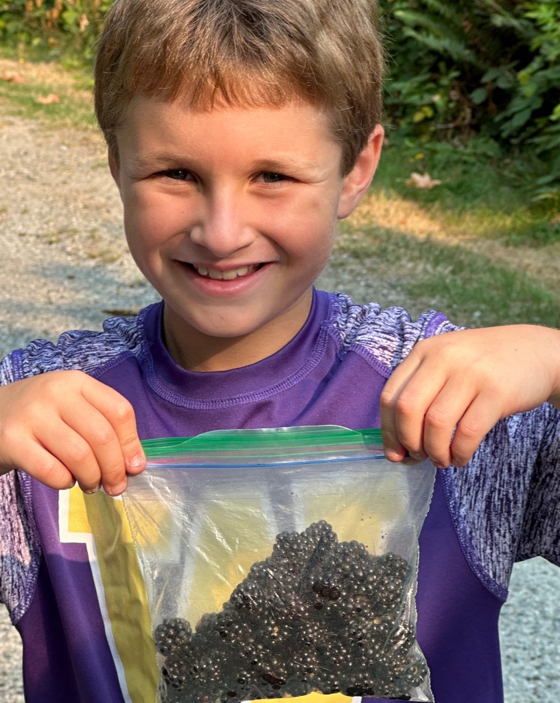 After breakfast the next day it was time to take a walk and pick blackberries! The BackEddy has lots of blackberry bushes that are ripening to perfection in August. With the six of us picking we soon had a big bag and headed back to the dock to launch and begin our summer boating journey together to Princess Louisa Inlet.