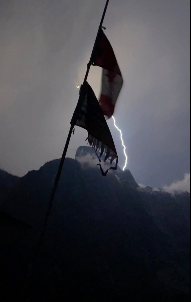 Anchored and shore tied we’ve enjoyed the last couple of days floating, kayaking, “yogaing”, cleaning and making new boating friends in the inlet. Then at 4:30 AM Tuesday morning the excitement began with a major thunder and lightning storm. Sometimes the lightning was so intense on the high mountains surrounding us we were completely blinded for a few seconds as our eyes adjusted back to the darkness. The lightning and thunder in the distance preceded a heavy rain. But soon the sound of the rain hitting the towering mountain above surrounded us. It reverberated around us like hail, but it was just rain. The lightening, thunder and rain continued for over two hours before it stopped and we could go back to sleep.