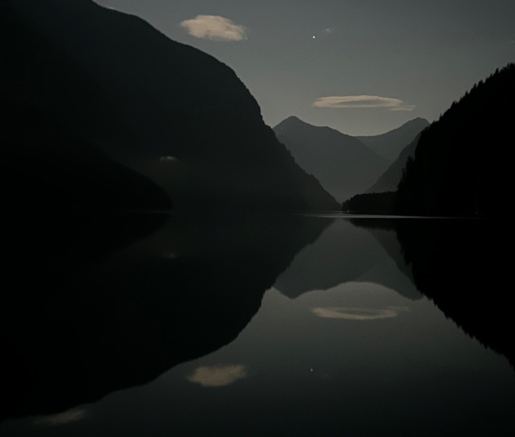Last night the stars twinkled brightly in both the sky and the reflection in the water, but we were too tired to stay up and enjoy them much. After a good night’s sleep last night however we expect to do some quality star watching tonight. Also we have been told that the bioluminescence in the water has been incredible around Egmont (abut 10 miles away), but we didn’t see any last night in Narrows Inlet. Hopefully, we will see some tonight and maybe some big shooting stars!