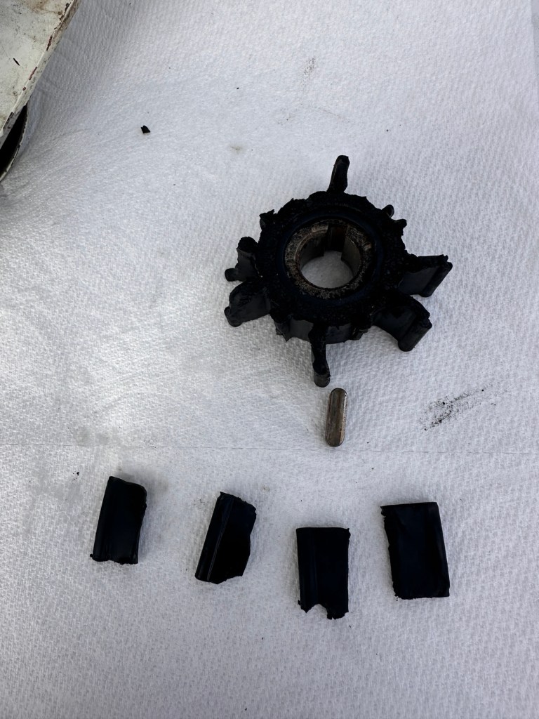 The impeller was broken into several pieces. After removing the sea pump, procuring and installing a new impeller (thank you Youtube) we with great fanfare turned it on and incredibly, it still didn’t work! No seawater was being expelled with the generator’s exhaust. We took a video to show Mike and he suggested we remove the pump and bring it over to Rick at the Madeira Park Marina. Rick is in high demand, doesn’t really talk to many people, but agreed to help us and check out our pump because we said Mike suggested it. He even came out and talked to Jim, which is highly unusual.
