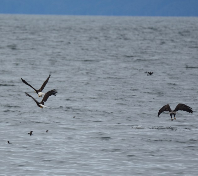 Then we spotted one, two, three eagles flying by and followed them to their destination: a big feeding party with all kinds of water fowl. I took lots of photos. Here are just a few. James and Robert, can you spot the eagle that has a fish in each talon?