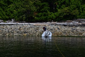 The first night we anchored in Otter Bay, near Chatham Point. It wasn’t perfect, but it was calm and a good place from which to venture out into Johnstone Strait and try our luck at some fishing in the salmon-rich waters. Sadly, our pitiful fishing continues. It took us an extremely long time to gather all of our gear for the first time this year. Once out, we tangled our lines and the fish took our bait, twice. Oh well.