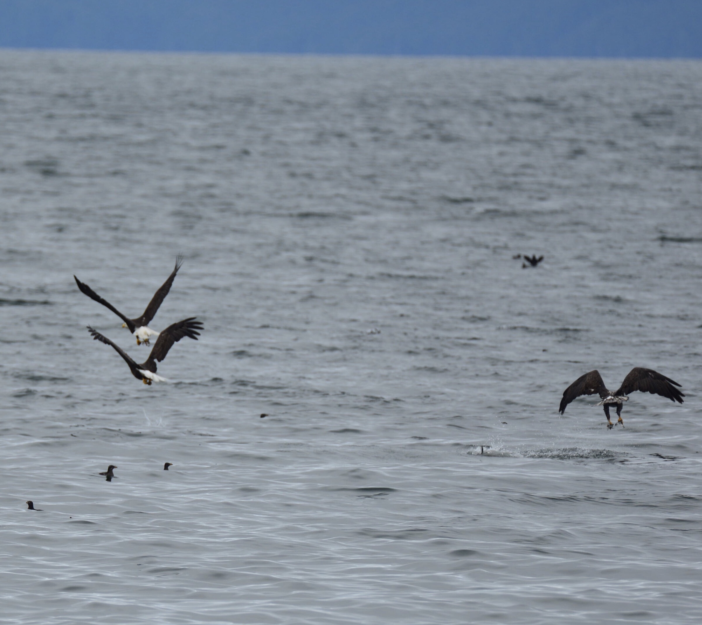 Then we spotted one, two, three eagles flying by and followed them to their destination: a big feeding party with all kinds of water fowl. I took lots of photos. Here are just a few. James and Robert, can you spot the eagle that has a fish in each talon?