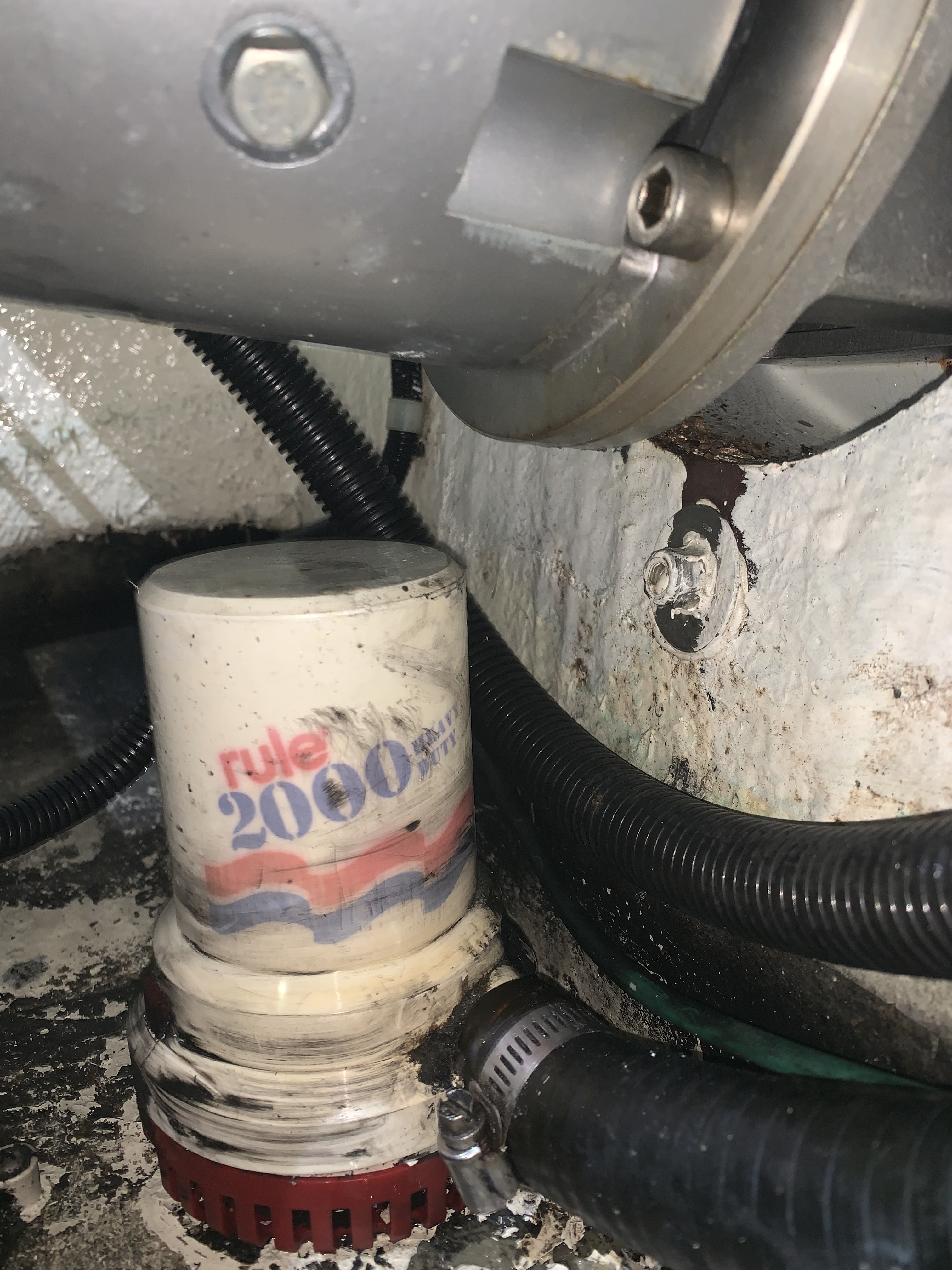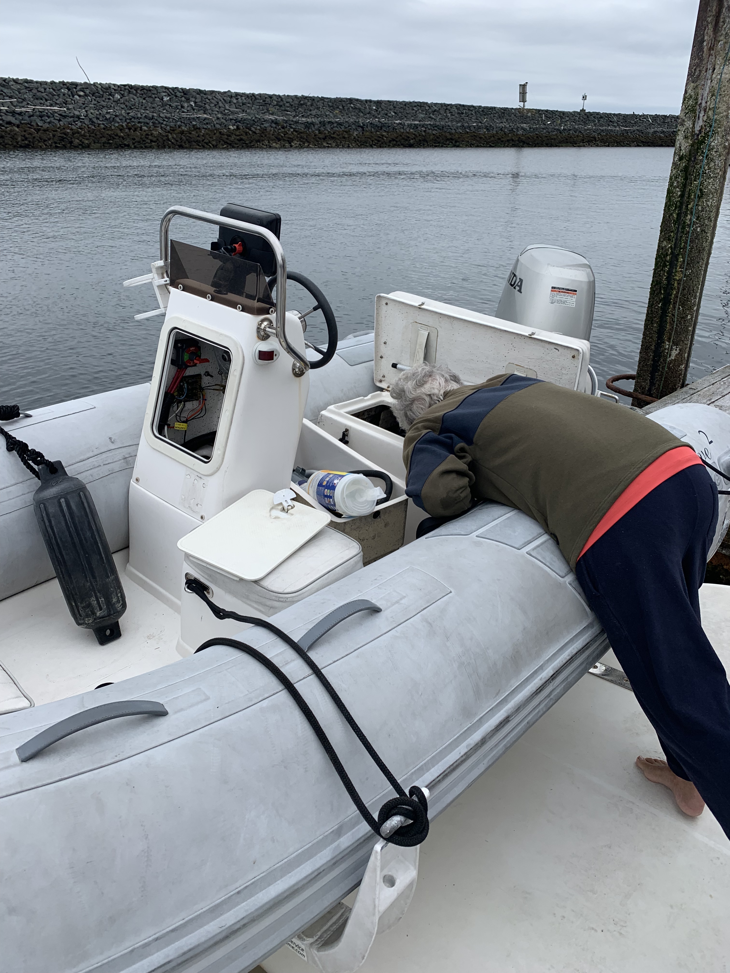 The Captain did some investigating of the tender that led to some cleaning and tidying of the bilge. He discovered that the fuel filter was not properly mounted but we easily found the proper screws and plugs in our newly organized equipment. Problem solved. Check!